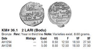 Maldives. Looks like 2 lari, but the diameter corresponds to 1/2 lari. Probably a 1/2 lari variety, which is not included in Krause’s catalog. A specialized catalog of Maldivian coins is needed.
