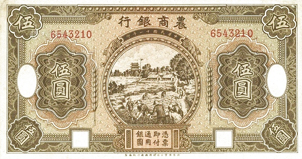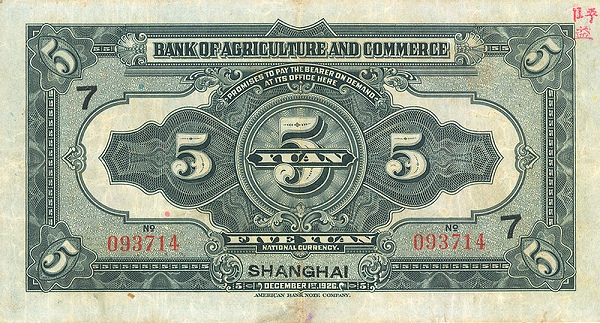 5 / 5 / BANK OF AGRICULTURAL AMD COMMERCE / PROMISES TO PAY THE BEARER ON DEMAND AT ITS OFFICE HERE LOCAL CURRENCY / 5 5 YUAN 5 / FIVE YUAN LOCAL CURRENCY / SHANGHAI / DECEMBER 1st 1926 / 5 / 5
