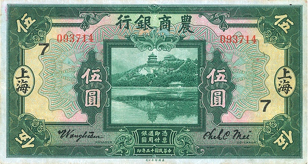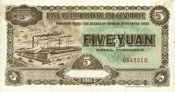 5 / 5 / BANK OF AGRICULTURAL AMD COMMERCE / PROMISES TO PAY THE BEARER ON DEMAND AT ITS OFFICE HERE FIVE YUAN LOCAL CURRENCY / 5 / 1921 / 5 / 5