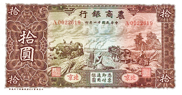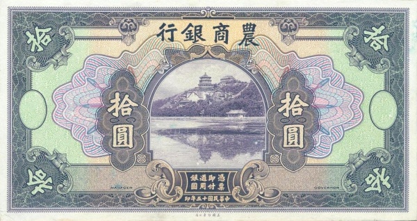 10 / 10 / BANK OF AGRICULTURAL AMD COMMERCE / PROMISES TO PAY THE BEARER ON DEMAND AT ITS OFFICE HERE TEN YUAN LOCAL CURRENCY / 10 / PEKING / 1921 / 10 / 10