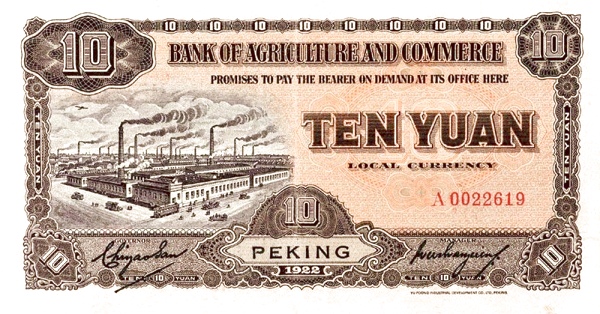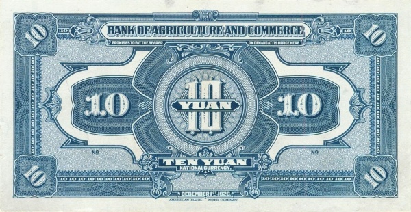 10 / 10 / BANK OF AGRICULTURAL AMD COMMERCE / PROMISES TO PAY THE BEARER ON DEMAND AT ITS OFFICE HERE LOCAL CURRENCY / 10 10 YUAN 10 / TEN YUAN LOCAL CURRENCY / DECEMBER 1st 1926 / 10 / 10