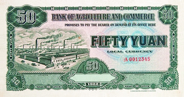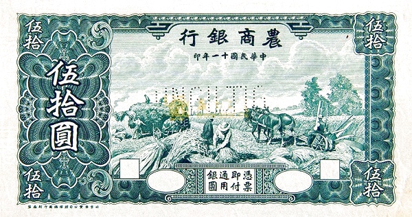 50 / 50 / BANK OF AGRICULTURAL AMD COMMERCE / PROMISES TO PAY THE BEARER ON DEMAND AT ITS OFFICE HERE FIFTY YUAN LOCAL CURRENCY / 50 / 1921 / 50 / 50