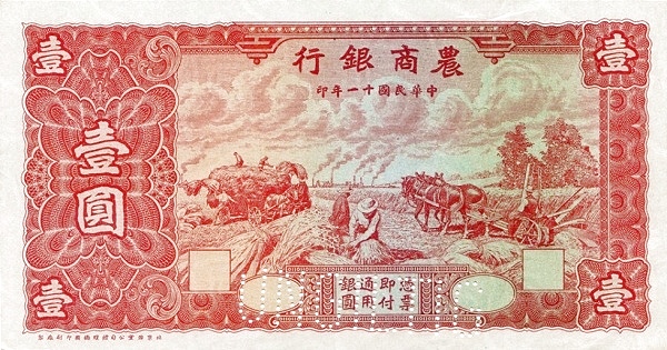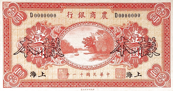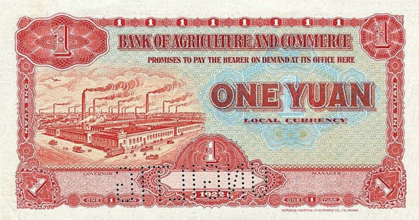 1 / 1 / BANK OF AGRICULTURAL AMD COMMERCE / PROMISES TO PAY THE BEARER ON DEMAND AT ITS OFFICE HERE ONE YUAN LOCAL CURRENCY / 1 / 1922 / 1 / 1