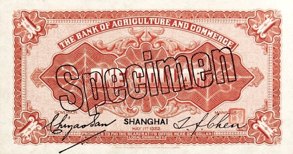 1 / 1 / THE BANK OF AGRICULTURAL AMD COMMERCE / ONE DOLLAR / SHANGHAI / MAY 1st 1922 / PROMISES TO PAY THE BEARER ON DEMAND AT ITS OFFICE HERE LOCAL CURRENCY / 1 / 1