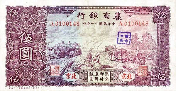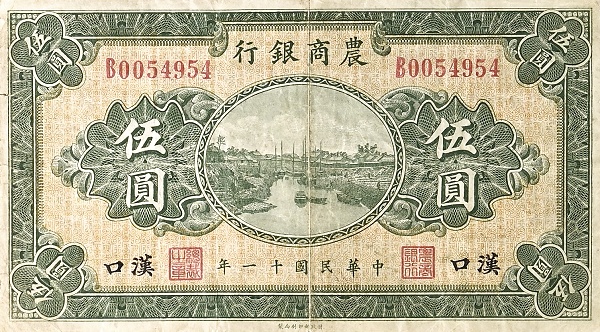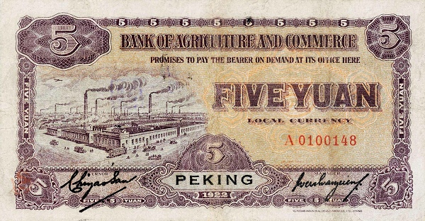 5 / 5 / BANK OF AGRICULTURAL AMD COMMERCE / PROMISES TO PAY THE BEARER ON DEMAND AT ITS OFFICE HERE FIVE YUAN LOCAL CURRENCY / 5 / PEKING / 1922 / 5 / 5