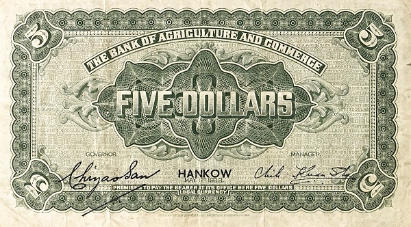 5 / 5 / THE BANK OF AGRICULTURAL AMD COMMERCE / FIVE DOLLARS / HAMKOW / MAY 1st 1922 / PROMISES TO PAY THE BEARER ON DEMAND AT ITS OFFICE HERE LOCAL CURRENCY / 5 / 5