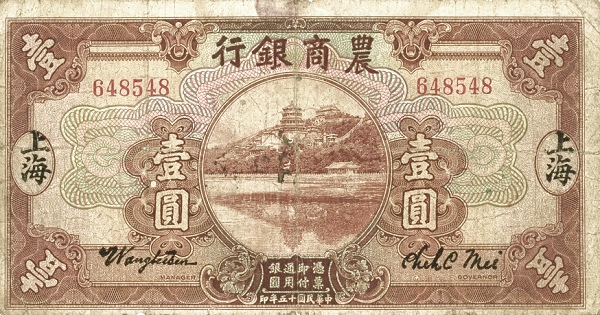 1 / 1 / BANK OF AGRICULTURAL AMD COMMERCE / PROMISES TO PAY THE BEARER ON DEMAND AT ITS OFFICE HERE LOCAL CURRENCY / 1 1 YUAN 1 / ONE YUAN LOCAL CURRENCY / DECEMBER 1st 1926 / 1 / 1