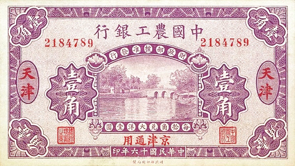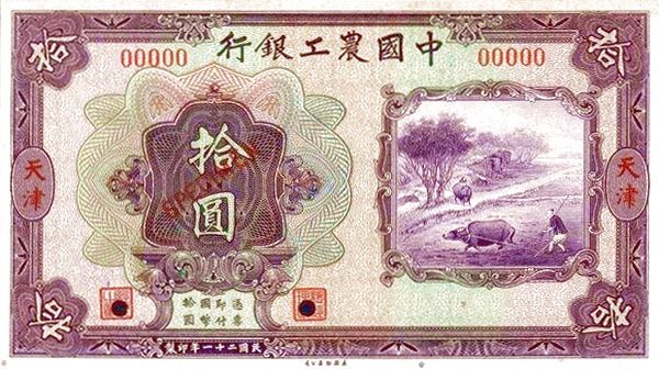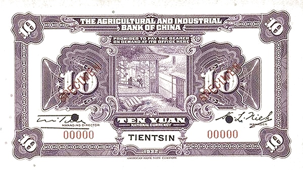 10 / 10 / THE AGRICULTURAL AMD INDUSTRIAL BANK OF CHINA / PROMISES TO PAY THE BEARER ON DEMAND AT ITS OFFICE HERE / 10 / TEN YUAN LOCAL CURRENCY / 10 / TENTSIN / 1932 / 10 / 10