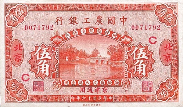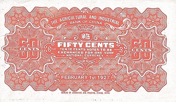 50 CENTS / THE AGRICULTURAL AMD INDUSTRIAL BANK OF CHINA / FIFTY CENTS / TEN 10 CENTS NOTES TO BE ECHANGED FOR ONE YUAN NATIONAL CURRENCY / FEBRUARY 1st 27 / 50 CENTS