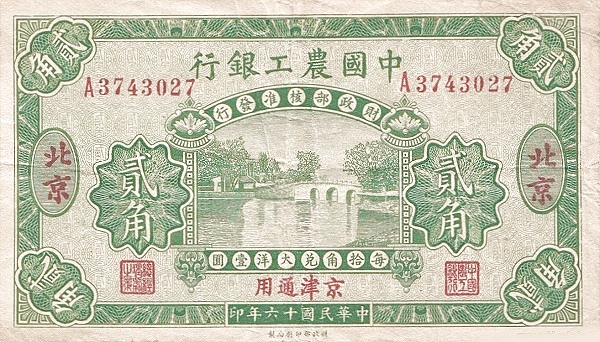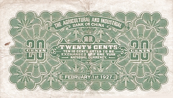 20 CENTS / THE AGRICULTURAL AMD INDUSTRIAL BANK OF CHINA / TWENTY CENTS / TEN 10 CENTS NOTES TO BE ECHANGED FOR ONE YUAN NATIONAL CURRENCY / FEBRUARY 1st 27 / 20 CENTS