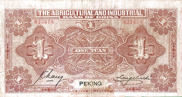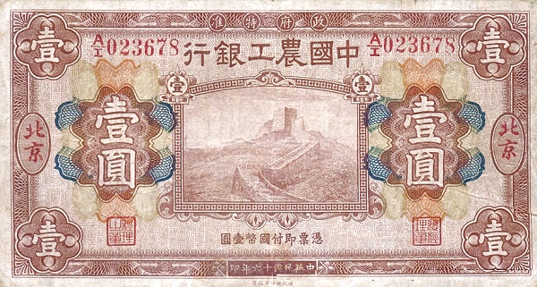 1 / 1 / THE AGRICULTURAL AMD INDUSTRIAL BANK OF CHINA / PROMISES TO PAY THE BEARER / 1 ONE YUAN 1 / ON DEMAND AT ITS OFFICE HERE ONE YUAN LOCAL CURRENCY / PEKING / SEPT. 1st 27 / 1 / 1