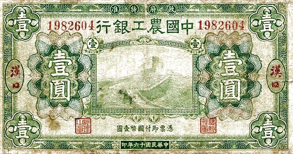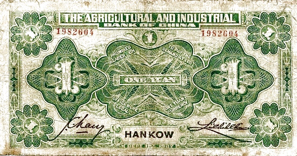 1 / 1 / THE AGRICULTURAL AMD INDUSTRIAL BANK OF CHINA / PROMISES TO PAY THE BEARER / 1 ONE YUAN 1 / ON DEMAND AT ITS OFFICE HERE ONE YUAN LOCAL CURRENCY / HANKOW / SEPT. 1st 27 / 1 / 1