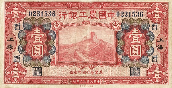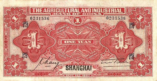 1 / 1 / THE AGRICULTURAL AMD INDUSTRIAL BANK OF CHINA / PROMISES TO PAY THE BEARER / 1 ONE YUAN 1 / ON DEMAND AT ITS OFFICE HERE ONE YUAN LOCAL CURRENCY / SHANGHAI / SEPT. 1st 27 / 1 / 1