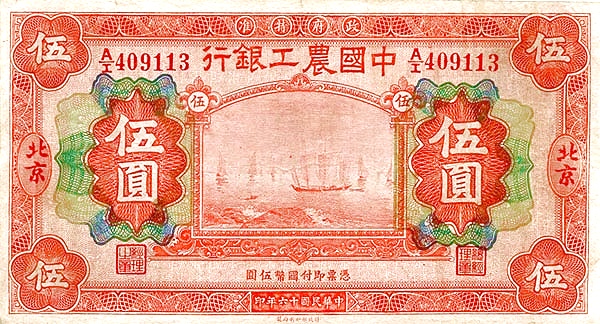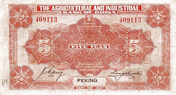 5 / 5 / THE AGRICULTURAL AMD INDUSTRIAL BANK OF CHINA / PROMISES TO PAY THE BEARER / 5 FIVE YUAN 5 / ON DEMAND AT ITS OFFICE HERE FIVE YUAN LOCAL CURRENCY / PEKING / SEPT. 1st 27 / 5 / 5