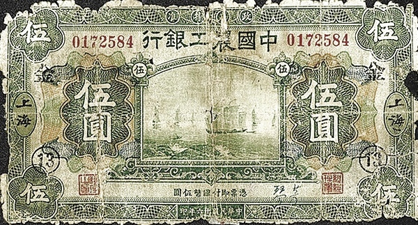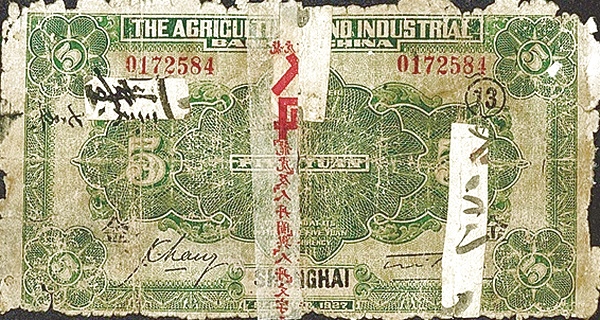5 / 5 / THE AGRICULTURAL AMD INDUSTRIAL BANK OF CHINA / PROMISES TO PAY THE BEARER / 5 FIVE YUAN 5 / ON DEMAND AT ITS OFFICE HERE FIVE YUAN LOCAL CURRENCY / SHANGHAI / SEPT. 1st 27 / 5 / 5