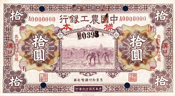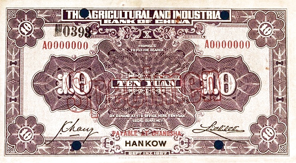 10 / 10 / THE AGRICULTURAL AMD INDUSTRIAL BANK OF CHINA / PROMISES TO PAY THE BEARER / 10 TEN YUAN 10 / ON DEMAND AT ITS OFFICE HERE TEN YUAN LOCAL CURRENCY / HANKOW / SEPT. 1st 27 / 10 / 10