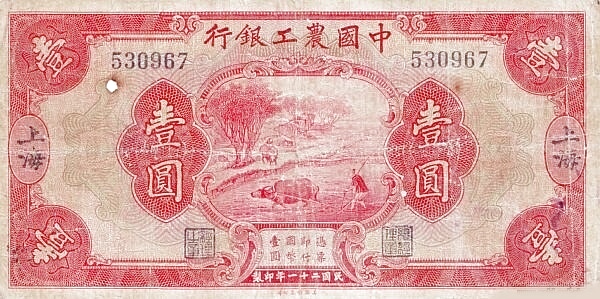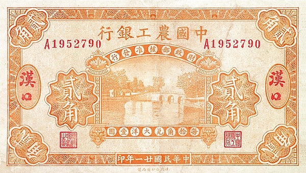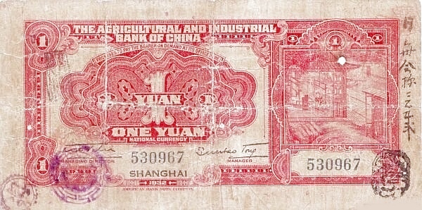 1 / 1 / THE AGRICULTURAL AMD INDUSTRIAL BANK OF CHINA / PROMISES TO PAY THE BEARER ON DEMAND AT ITS OFFICE HERE / 1 / ONE YUAN LOCAL CURRENCY / 1 / SHANGHAI / 1932 / 1 / 1