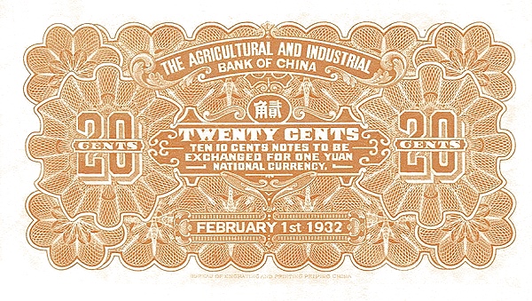20 CENTS / THE AGRICULTURAL AMD INDUSTRIAL BANK OF CHINA / TWENTY CENTS / TEN 10 CENTS NOTES TO BE ECHANGED FOR ONE YUAN NATIONAL CURRENCY / FEBRUARY 1st 32 / 20 CENTS