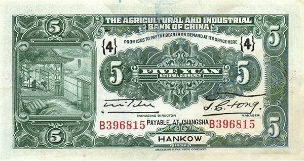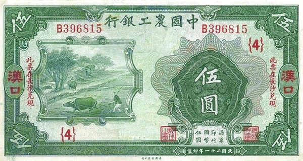 5 / 5 / THE AGRICULTURAL AMD INDUSTRIAL BANK OF CHINA / PROMISES TO PAY THE BEARER ON DEMAND AT ITS OFFICE HERE / 5 / FIVE YUAN LOCAL CURRENCY / 5 / HANKOW / 1932 /5 / 5