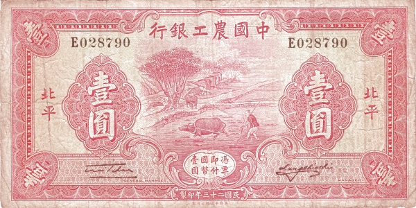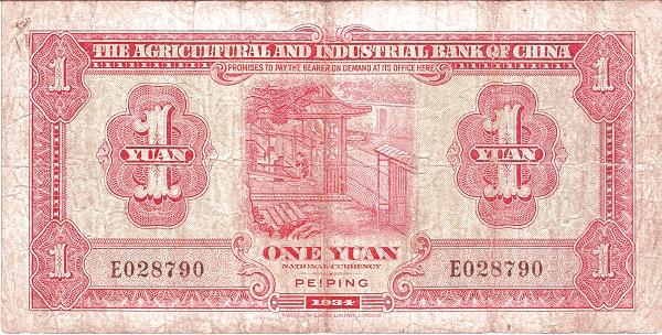 1 / 1 / THE AGRICULTURAL AMD INDUSTRIAL BANK OF CHINA / PROMISES TO PAY THE BEARER ON DEMAND AT ITS OFFICE HERE / 1 / ONE YUAN LOCAL CURRENCY / 1 / PEIPING / 1932 / 1 / 1