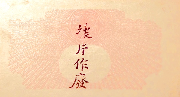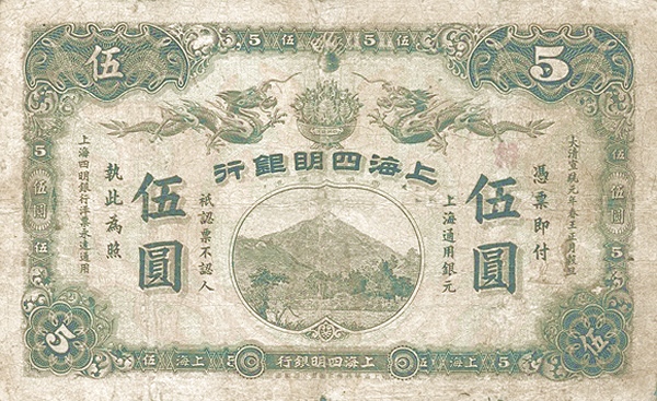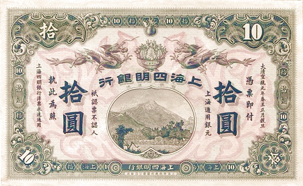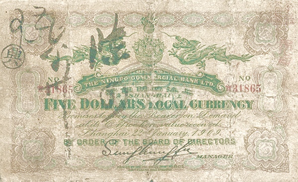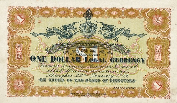 1 / THE NINGPO COMMERCIAL BANK LTD. / $1 / ONE DOLLAR LOCAL CURRENCY / PROMISES TO PAY THE BEARER ON DEMAND AT ITS OFFICE HER VALUE RECIEVED / SHANGHAI 22 JANUARY 1909 / BY ORDER OF THE BOARD OF DIRECTORS / 1