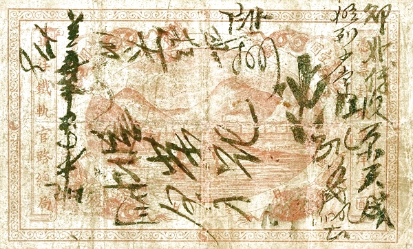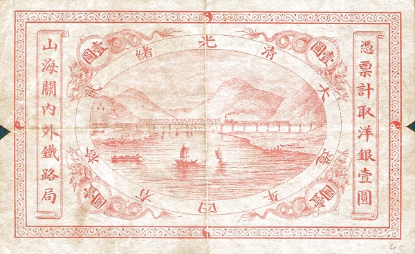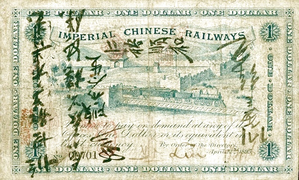 1 / ONE DOLLAR / 1 / IMPERIAL CHINESE RAILWAYS / PROMISES TO PAY ON DEMAND AT ANY OF ITS OFFICES ONE DOLLAR OR ITS EQUIVALENT IN LOCAL CURRENCY / BY ORDER OF THE DIRECTOR / APRIL 22nd 1895 / 1 / ONE DOLLAR / 1