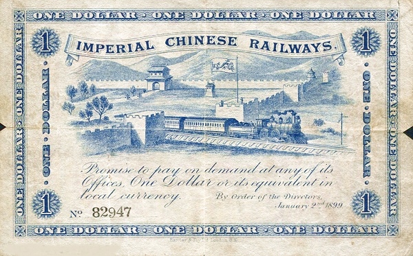 1 / ONE DOLLAR / 1 / IMPERIAL CHINESE RAILWAYS / PROMISES TO PAY ON DEMAND AT ANY OF ITS OFFICES ONE DOLLAR OR ITS EQUIVALENT IN LOCAL CURRENCY / BY ORDER OF THE DIRECTOR / JANUARY 2nd 1899 / 1 / ONE DOLLAR / 1