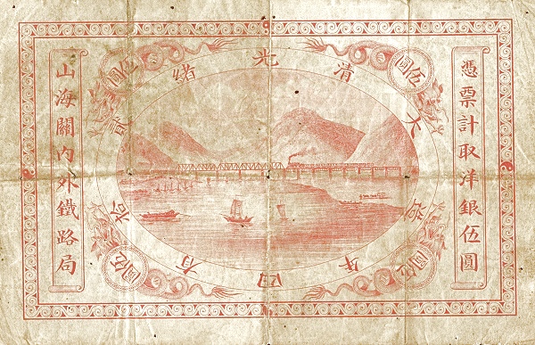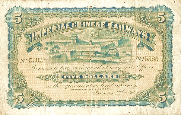5 / 5 / IMPERIAL CHINESE RAILWAYS / PROMISES TO PAY ON DEMAND AT ANY OF ITS OFFICES FIVE DOLLARS OR ITS EQUIVALENT IN LOCAL CURRENCY / BY ORDER OF THE DIRECTOR / JANUARY 2nd 1899 / 5 / 5