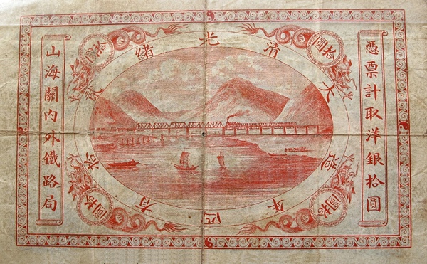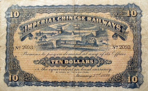 10 / 10 / IMPERIAL CHINESE RAILWAYS / PROMISES TO PAY ON DEMAND AT ANY OF ITS OFFICES TEN DOLLARS OR ITS EQUIVALENT IN LOCAL CURRENCY / BY ORDER OF THE DIRECTOR / JANUARY 2nd 1899 / 10 / 10