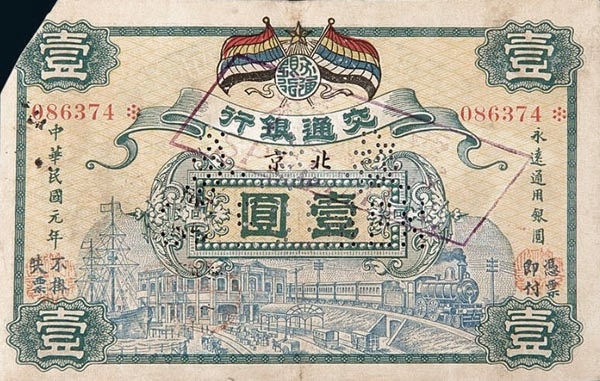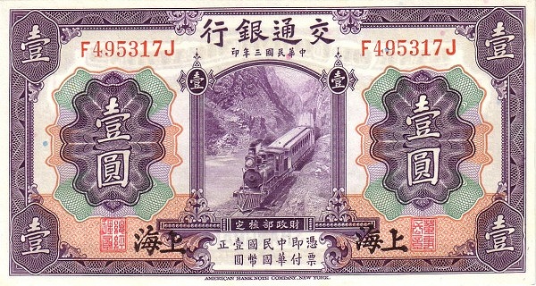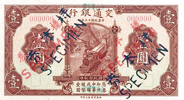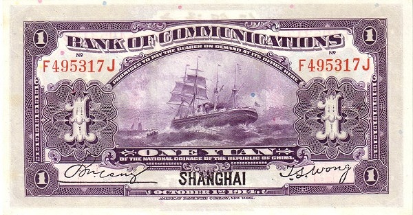 1 / 1 / BANK OF COMMUNICATIONS / PROMISES TO PAY THE BEARER ON DEMAND AT ITS OFFICE HERE / 1 / 1 / ONE YUAN OF NATIONAL COINAGE OF THE REPUBLIC OF CHINA / SHANGHAI OCTOBER 1st 1914 / 1 / 1