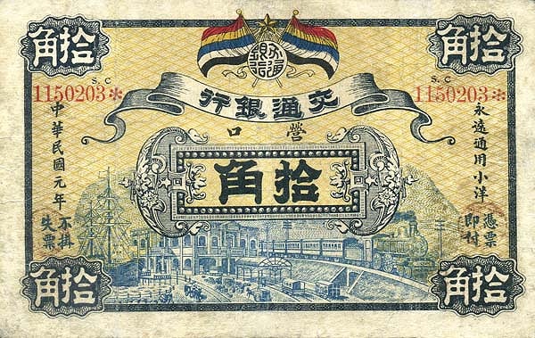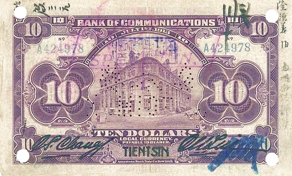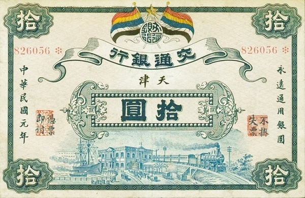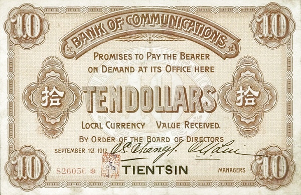10 / 10 / BANK OF COMMUNICATIONS / PROMISES TO PAY THE BEARER ON DEMAND AT ITS OFFICE HERE TEN DOLLARS LOCAL CURRENCY VALUE RECEIVED BY ORDER OF THE BOARD OF DIRECTIONS / SEPTEMBER 1st 1912 / TIENTSIN / 10 / 10