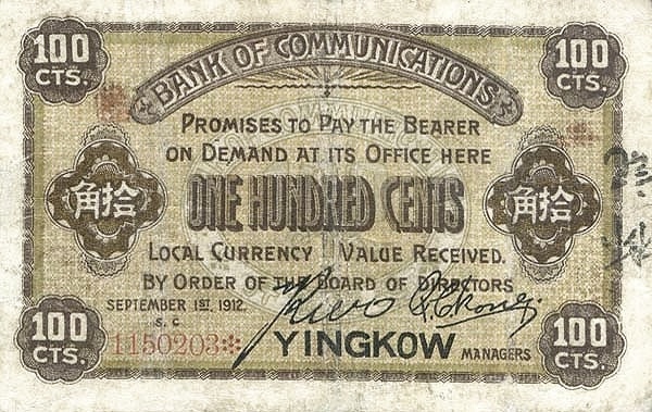 100 CTS / 100 CTS / BANK OF COMMUNICATIONS / PROMISES TO PAY THE BEARER ON DEMAND AT ITS OFFICE HERE ONE HUNDRED CENTS LOCAL CURRENCY VALUE RECEIVED BY ORDER OF THE BOARD OF DIRECTIONS / SEPTEMBER 1st 1912 / YINGKOW / 100 CTS / 100 CTS
