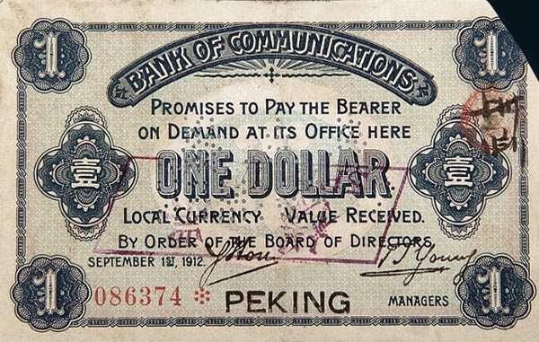 1 / 1 / BANK OF COMMUNICATIONS / PROMISES TO PAY THE BEARER ON DEMAND AT ITS OFFICE HERE ONE DOLLAR LOCAL CURRENCY VALUE RECEIVED BY ORDER OF THE BOARD OF DIRECTIONS / SEPTEMBER 1st 1912 / PEKING / 1 / 1