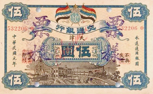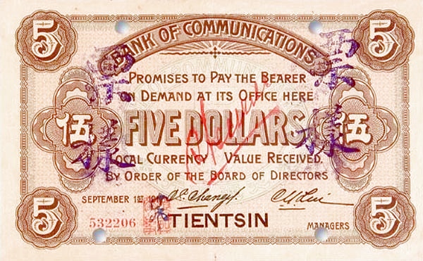5 / 5 / BANK OF COMMUNICATIONS / PROMISES TO PAY THE BEARER ON DEMAND AT ITS OFFICE HERE FIVE DOLLARS LOCAL CURRENCY VALUE RECEIVED BY ORDER OF THE BOARD OF DIRECTIONS / SEPTEMBER 1st 1912 / TIENTSIN / 5 / 5