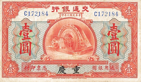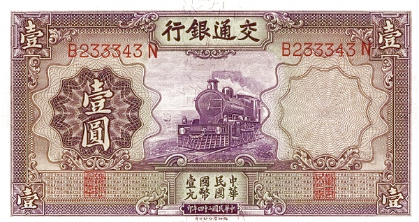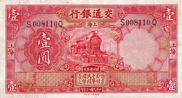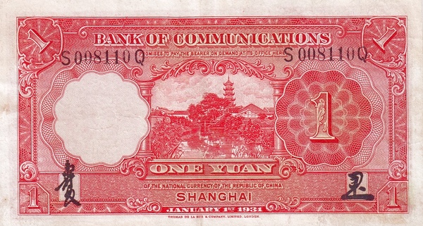 1 / 1 / BANK OF COMMUNICATIONS / PROMISES TO PAY THE BEARER ON DEMAND IN ITS OFFICE HERE / 1 / ONE YUAN OF THE NATIONAL CURRENCY OF THE REPUBLIC OF CHINA / SHANGHAI JANUARY 1st 1931 / 1 / 1