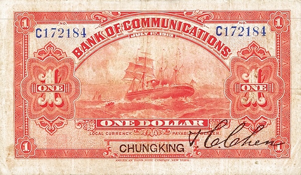 1 / 1 / BANK OF COMMUNICATIONS / JULY 1st 1913 / 1 ONE / 1 ONE / ONE DOLLAR LOCAL CURRENCY PAYABLE TO BEARER / CHUNGKING / 1 / 1