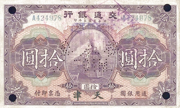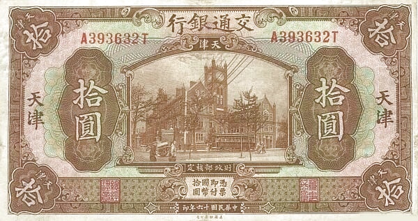 10 YUAN TIENTSIN / 10 YUAN SHTIENTSIN / BANK OF COMMUNICATIONS / PROMISES TO PAY THE BEARER ON DEMAND IN ITS OFFICE HERE / 10 / 10 YUAN / 10 / TEN YUAN NATIONAL CURRENCY / TIENTSIN NOVEMBER 1st 1927 / 10 YUAN TIENTSIN / 10 YUAN TIENTSIN
