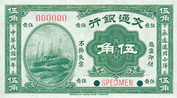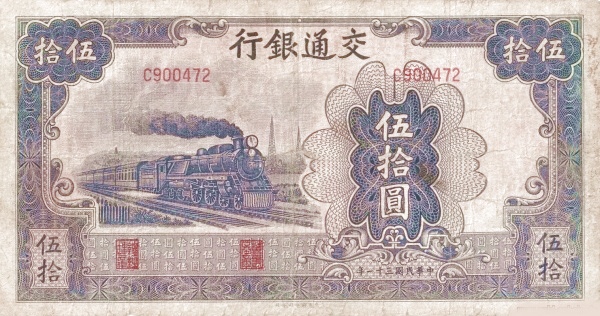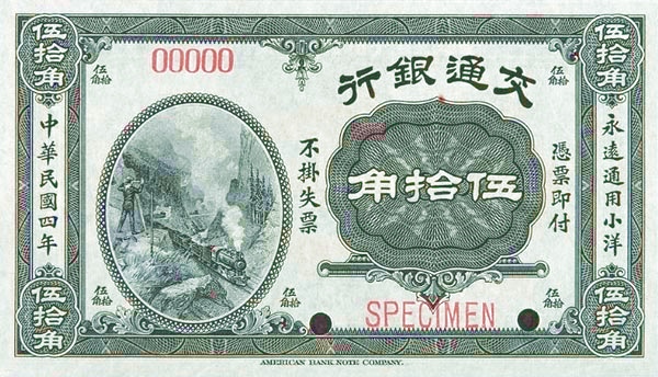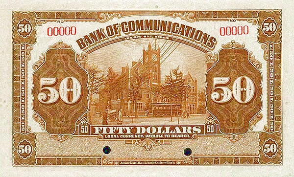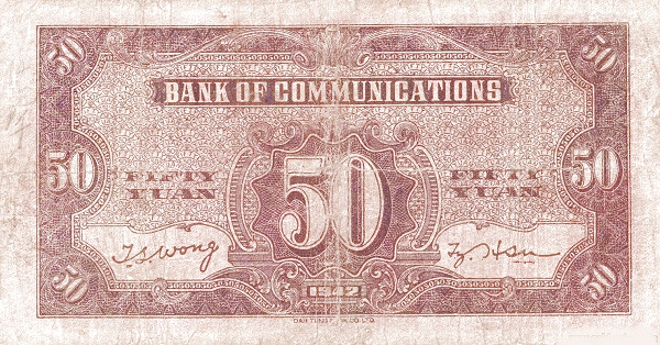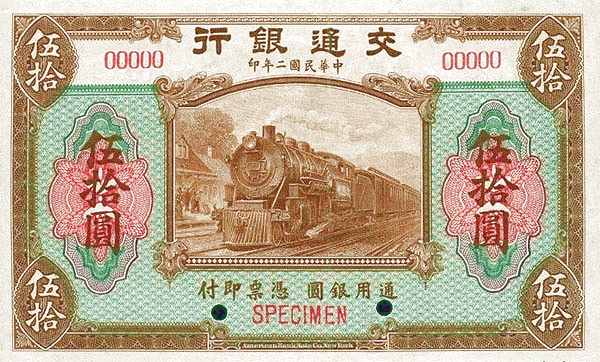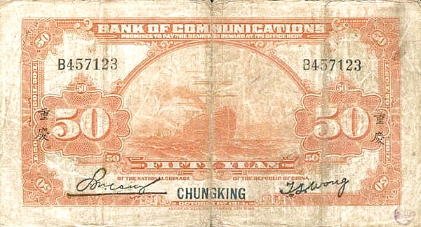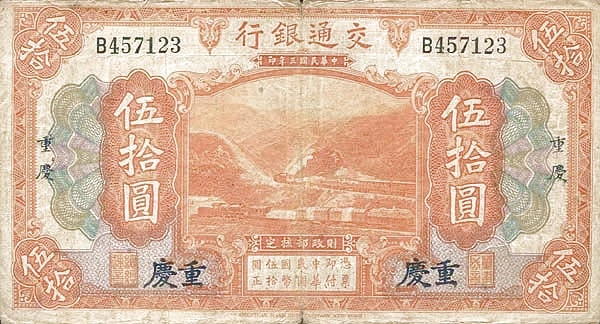 50 / 50 / BANK OF COMMUNICATIONS / PROMISES TO PAY THE BEARER ON DEMAND AT ITS OFFICE HERE / 50 / 50 / FIFTY YUAN OF NATIONAL COINAGE OF THE REPUBLIC OF CHINA / CHUNGKING OCTOBER 1st 1914 / 50 / 50