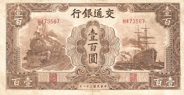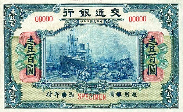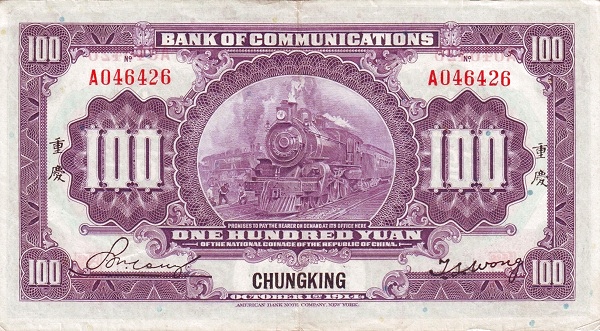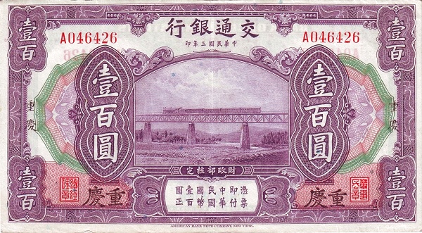 100 / 100 / BANK OF COMMUNICATIONS / 100 / 100 / PROMISES TO PAY THE BEARER ON DEMAND AT ITS OFFICE HERE ONE HUNDRED YUAN OF NATIONAL COINAGE OF THE REPUBLIC OF CHINA / CHUNGKING OCTOBER 1st 1914 / 100 / 100
