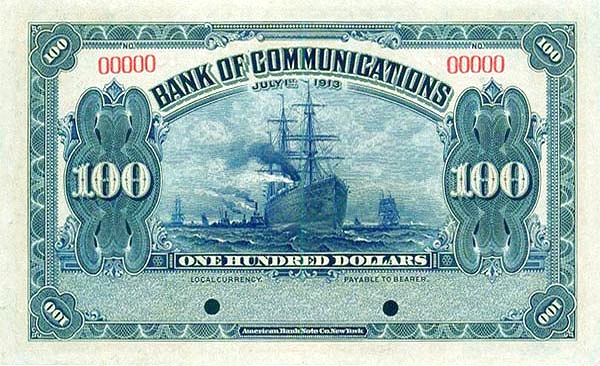 100 / 100 / BANK OF COMMUNICATIONS / JULY 1st 1913 / 100 / 100 / ONE HUNDRED DOLLARS LOCAL CURRENCY PAYABLE TO BEARER / 100 / 100