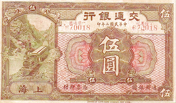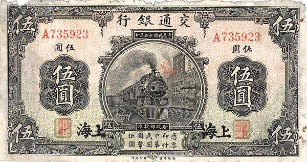 5 / 5 / BANK OF COMMUNICATIONS / 5 / PROMISES TO PAY THE BEARER ON DEMAND IN ITS OFFICE HERE / FIVE YUAN OF THE NATIONAL CURRENCY OF THE REPUBLIC OF CHINA / 5 / SHANGHAI JULY 1st 1924 / 5 / 5
