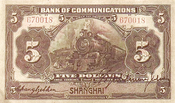 5 / 5 / BANK OF COMMUNICATIONS / 5 JULY 1st 1913 5 / 5 / 5 / FIVE DOLLARS LOCAL CURRENCY PAYABLE TO BEARER / SHANGHAI / 5 / 5
