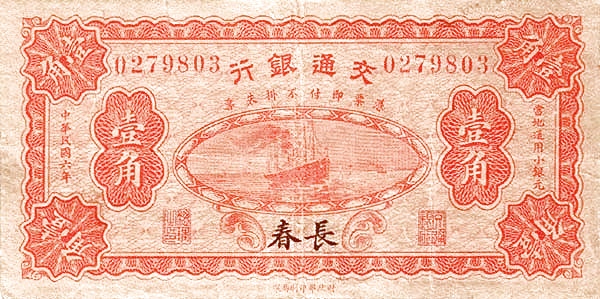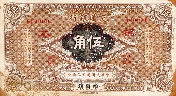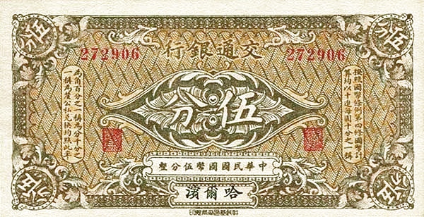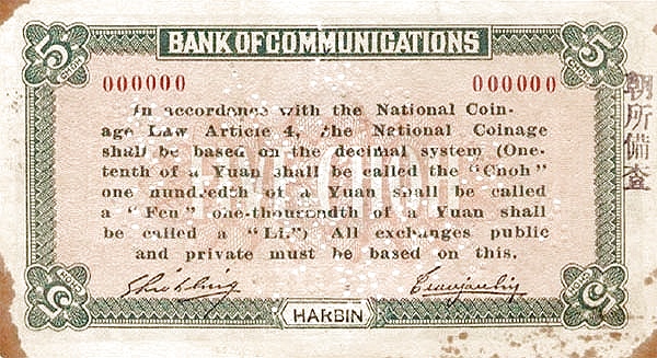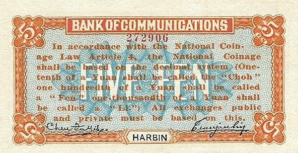5 CHON / 5 CHON / BANK OF COMMUNICATIONS / IN ACCORDANCE WITH THE NATIONAL COINAGE LAW ARTICLE 4, THE NATIONAL COINAGE SHALL BE BASED ON THE DECIMAL SYSTEM (ONE-TENTH OF A YUAN SHALL BE CALLED THE "CHOH" ONE HUNDREDTH OF A YUAN SHALL BE CALLED A "FEN" ONE-THOUSANDTH OF A YUAN SHALL BE CALLED A "LI".) ALL EXCHANGES PUBLIC AND PRIVATE MUST BE BASED ON THIS / HARBIN / 5 CHON / 5 CHON