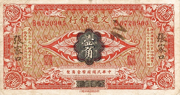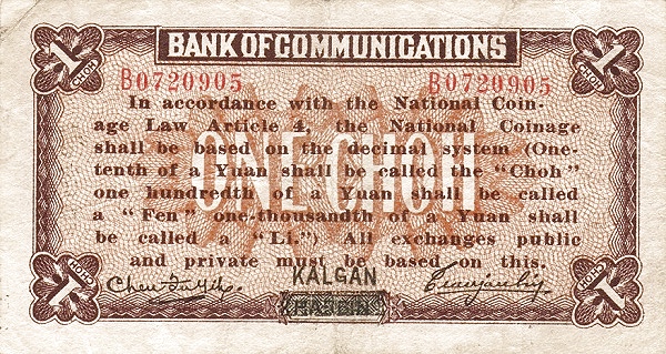 1 CHON / 1 CHON / BANK OF COMMUNICATIONS / IN ACCORDANCE WITH THE NATIONAL COINAGE LAW ARTICLE 4, THE NATIONAL COINAGE SHALL BE BASED ON THE DECIMAL SYSTEM (ONE-TENTH OF A YUAN SHALL BE CALLED THE "CHOH" ONE HUNDREDTH OF A YUAN SHALL BE CALLED A "FEN" ONE-THOUSANDTH OF A YUAN SHALL BE CALLED A "LI".) ALL EXCHANGES PUBLIC AND PRIVATE MUST BE BASED ON THIS / KALGAN / 1 CHON / 1 CHON