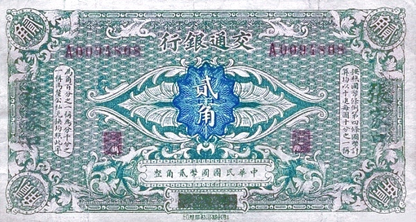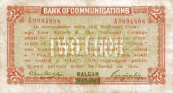 2 CHON / 2 CHON / BANK OF COMMUNICATIONS / IN ACCORDANCE WITH THE NATIONAL COINAGE LAW ARTICLE 4, THE NATIONAL COINAGE SHALL BE BASED ON THE DECIMAL SYSTEM (ONE-TENTH OF A YUAN SHALL BE CALLED THE "CHOH" ONE HUNDREDTH OF A YUAN SHALL BE CALLED A "FEN" ONE-THOUSANDTH OF A YUAN SHALL BE CALLED A "LI".) ALL EXCHANGES PUBLIC AND PRIVATE MUST BE BASED ON THIS / KALGAN / 2 CHON / 2 CHON