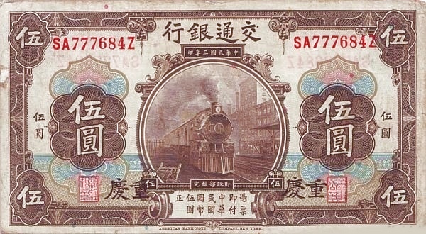 5 / 5 / BANK OF COMMUNICATIONS / PROMISES TO PAY THE BEARER ON DEMAND AT ITS OFFICE HERE / 5 / 5 / FIVE YUAN OF NATIONAL COINAGE OF THE REPUBLIC OF CHINA / CHUNGKING OCTOBER 1st 1914 / 5 / 5