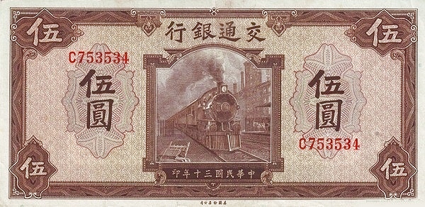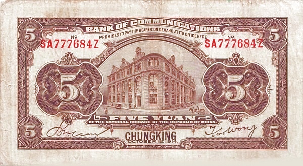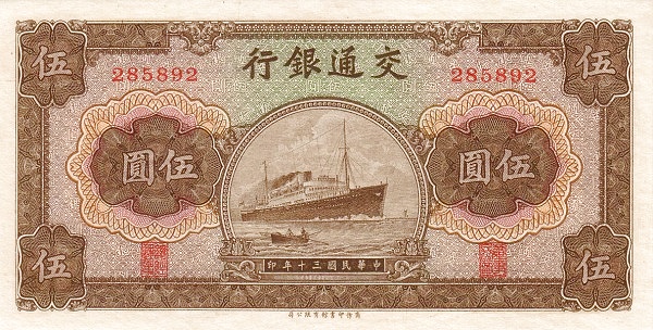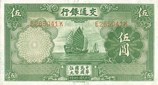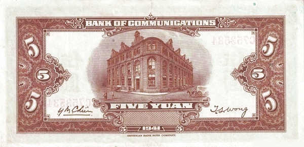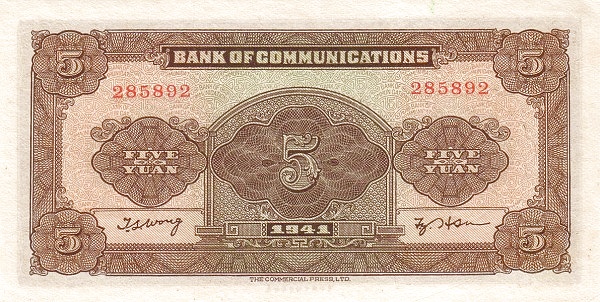 5 / 5 / BANK OF COMMUNICATIONS / 5 / FIVE YUAN / 5 / 1941 / 5 / 5