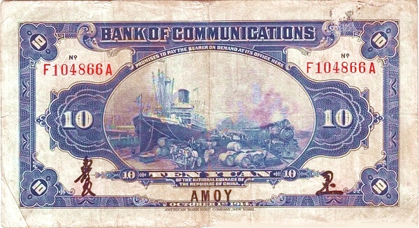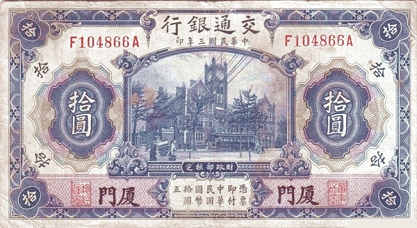 10 / 10 / BANK OF COMMUNICATIONS / PROMISES TO PAY THE BEARER ON DEMAND AT ITS OFFICE HERE / 10 / 10 / TEN YUAN OF NATIONAL COINAGE OF THE REPUBLIC OF CHINA / AMOY OCTOBER 1st 1914 / 10 / 10