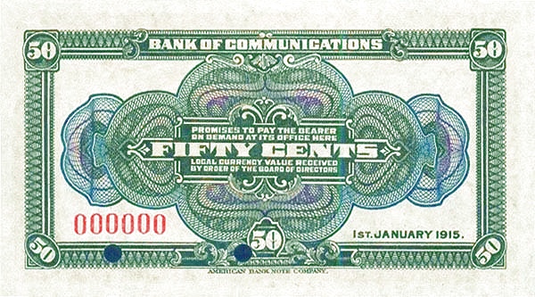 50 / 50 / BANK OF COMMUNICATIONS / PROMISES TO PAY THE BEARER ON DEMAND AT ITS OFFICE HERE LOCAL FIFTY CENTS CURRENCY VALUE RECIEVED BY ORDER OF THE BOARD OF DIRECTORS / 50 / 1st JANUARY 1915 / 50 / 50