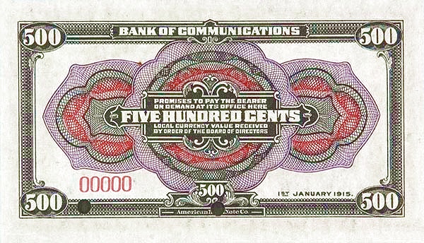 500 / 500 / BANK OF COMMUNICATIONS / PROMISES TO PAY THE BEARER ON DEMAND AT ITS OFFICE HERE LOCAL FIVE HUNDRED CENTS CURRENCY VALUE RECIEVED BY ORDER OF THE BOARD OF DIRECTORS / 500 / 1st JANUARY 1915 / 500 / 500